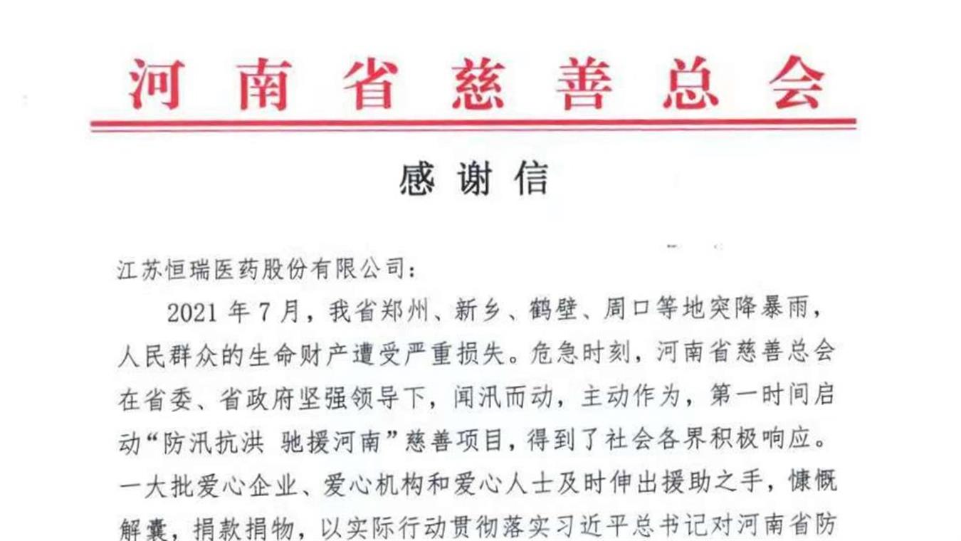 恒瑞醫藥向河南省慈善總會捐贈1000萬元,用于公共衛生系統災后恢復和建設發展等工作。