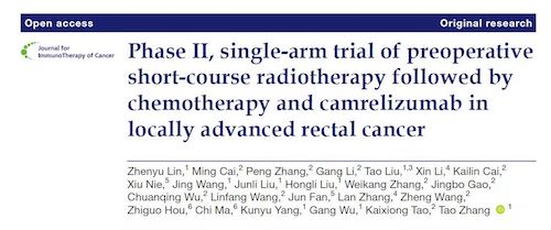2021年(nian)11月1日,一項由(you)華中(zhong)(zhong)(zhong)科技大學(xue)(xue)(xue)同(tong)濟醫(yi)學(xue)(xue)(xue)院(yuan)附屬協(xie)和醫(yi)院(yuan)腫(zhong)瘤中(zhong)(zhong)(zhong)心張(zhang)濤教授(shou)和陶凱(kai)雄(xiong)教授(shou)團隊(dui)開(kai)展(zhan)的(de)“短(duan)程放(fang)療(liao)(SCRT)序(xu)貫卡瑞利珠單抗聯合(he)CAPOX新輔助治(zhi)療(liao)后延遲(chi)手術(shu)治(zhi)療(liao)局部晚期直腸癌(ai)(LARC)的(de)單臂II期研究(jiu)(NCT04231552)”成果在The Journal for ImmunoTherapy of Cancer上全文發(fa)表。該雜志是腫(zhong)瘤免疫治(zhi)療(liao)學(xue)(xue)(xue)會的(de)官方期刊(kan),2018年(nian)IF為(wei)8.728分,在158本(ben)免疫學(xue)(xue)(xue)SCI期刊(kan)中(zhong)(zhong)(zhong)排(pai)名第12,2021年(nian)IF已升至13.751分。