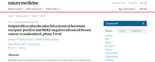 11月4日,國(guo)際四大(da)醫(yi)(yi)學(xue)(xue)期刊(kan)之一、英國(guo)《自(zi)然》旗下《自(zi)然醫(yi)(yi)學(xue)(xue)》(Nature Medicine)在線發表CDK4/6抑(yi)制(zhi)劑(ji)(ji)(ji)達爾(er)西(xi)利(li)(li)(SHR6390)聯(lian)合氟(fu)(fu)(fu)維司(si)群(qun)治療既(ji)往(wang)內(nei)分泌(mi)治療后疾病進展(zhan)的HR+/HER2-晚(wan)期乳(ru)腺癌的多(duo)中(zhong)心、隨機、雙盲(mang)III期臨(lin)床研究(DAWNA-1研究)中(zhong)期分析結果(guo)報(bao)告,首次對氟(fu)(fu)(fu)維司(si)群(qun)(雌(ci)激(ji)素(su)受(shou)(shou)體降解劑(ji)(ji)(ji))±達爾(er)西(xi)利(li)(li)治療激(ji)素(su)受(shou)(shou)體陽(yang)性晚(wan)期乳(ru)腺癌的有效性和安全性進行(xing)了(le)比較。研究結果(guo)顯(xian)示,達爾(er)西(xi)利(li)(li)+氟(fu)(fu)(fu)維司(si)群(qun)組與安慰(wei)劑(ji)(ji)(ji)+氟(fu)(fu)(fu)維司(si)群(qun)組相比,無進展(zhan)生存期(PFS)顯(xian)著延(yan)長。該項研究由(you)中(zhong)國(guo)醫(yi)(yi)學(xue)(xue)科學(xue)(xue)院(yuan)腫(zhong)瘤醫(yi)(yi)院(yuan)徐(xu)兵河教授擔任leading PI,全國(guo)39家醫(yi)(yi)院(yuan)參(can)研,由(you)恒瑞(rui)醫(yi)(yi)藥(yao)臨(lin)床研發團隊支持(chi)完成。