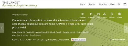 近日,恒瑞醫(yi)藥自主研發創(chuang)新藥卡瑞利珠單抗聯(lian)合(he)阿帕替尼(ni)二線治療晚期食管鱗癌的多(duo)中心Ⅱ期臨床(chuang)研究(CAP 02研究)于國際知名(ming)醫(yi)學期刊(kan)《柳葉刀》子刊(kan)《柳葉刀·胃(wei)腸病(bing)與(yu)肝臟病(bing)學》雜志( Lancet Gastroenterol & Hepatol,IF:18.5 )全文在線發表。