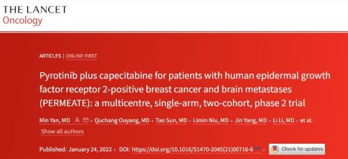[1] Yan M, Ouyang Q, Sun T, et al. Pyrotinib plus capecitabine for patients with human epidermal growth factor receptor 2-positive breast cancer and brain metastases (PERMEATE): a multicentre, single-arm, two-cohort,phase 2 trial. Lancet Oncol 2022; published online Jan 24. //doi.org/10.1016/S1470-2045(21)00716-6