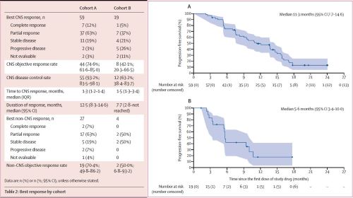 圖:主要終點(dian)CNS-ORR(隊列A 74.6%,隊列B 42.1%)和(he)次要終點(dian)PFS(隊列A 11.3m,隊列B 5.6m)結(jie)果