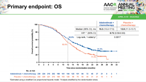 本次大會上口頭報告的研究結果顯示,中位隨訪時間13.5個月,阿得貝利單抗聯合化療組和安慰劑聯合化療組中位OS分別為15.3個月和12.8個月。1年OS率為62.9%vs52.0%,2年OS率為31.3%vs17.2%。獨立評審委員會(IRC)評估的無進展生存期(PFS)為5.8個月vs5.6個月,6個月PFS率分別為49.4%和37.3%,12個月PFS率分別為19.7%和5.9%,ORR分別為70.4%和65.9%,DoR分別為5.6個月和4.6個月,目前顯示獲益趨勢[8]。