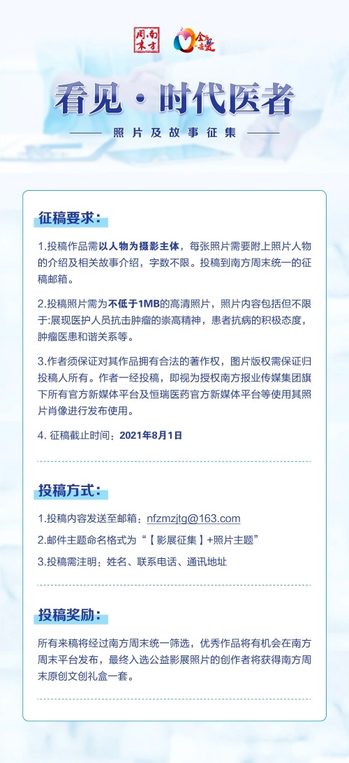 站(zhan)在建黨百年的(de)(de)節點,為了向(xiang)這些對健康中國(guo)有(you)著(zhu)重要意義的(de)(de)人(ren)物致敬,恒瑞醫藥“全力去愛(ai)”患者(zhe)(zhe)關愛(ai)公益品牌聯合(he)南方周(zhou)末,發起《看見(jian)·時代醫者(zhe)(zhe)》主題(ti)公益線上影(ying)展,用圖(tu)像記(ji)錄守(shou)護(hu)生命的(de)(de)面(mian)孔,為中國(guo)健康事(shi)業(ye)的(de)(de)發展腳步存(cun)檔。現向(xiang)全社會(hui)征集腫瘤科醫護(hu)人(ren)員(yuan)及患者(zhe)(zhe)的(de)(de)人(ren)物攝影(ying)照片并分(fen)享照片背后(hou)的(de)(de)故事(shi)。