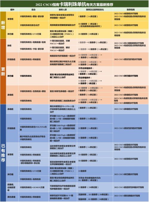 卡瑞利珠單抗有關方案,在2022 CSCO診療指南中(zhong)獲(huo)(huo)得的臨床推薦(jian)最多(duo),既有基(ji)于最新醫學證據(ju)獲(huo)(huo)得的新增推薦(jian),亦有證據(ju)等(deng)級提(ti)(ti)升后推薦(jian)等(deng)級提(ti)(ti)高。