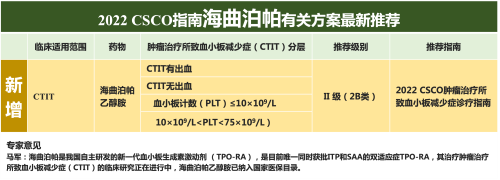 海曲泊帕乙醇胺片作為我國自主研發上市的新一代的TPO-RA類藥物,已獲批免疫性血小板減少癥(ITP)和重型再生障礙性貧血(SAA)兩個適應癥,已進入國家醫保目錄,其治療CTIT的臨床研究正在進行中。首次發布的CTIT診療指南推薦包含海曲泊帕乙醇胺在內的TPO-RA,用于治療CTIT有出血、CTIT無出血(血小板計數(PLT)≤10×109/L和10×109/L<plt<75×109/L),推薦級(ji)別均為II級(ji)(2B類證據)。