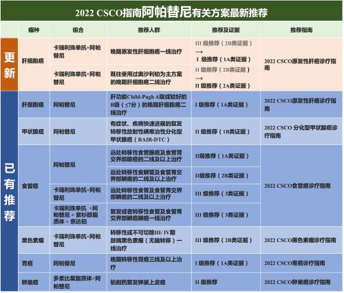 阿帕替尼(ni)單藥方(fang)案、“雙艾(ai)”組合方(fang)案或“雙艾(ai)”再聯(lian)合化(hua)療方(fang)案,在肝(gan)細(xi)胞癌、甲狀腺癌、食管癌、黑(hei)色(se)素(su)瘤、胃(wei)癌和卵巢癌領域,獲(huo)得(de)2022 CSCO指南11項推(tui)薦。