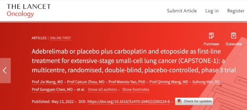 北京時間2022年5月14日,恒瑞醫藥自主研發的PD-L1抑制劑阿得貝利單抗治療廣泛期小細胞肺癌的III期臨床研究(CAPSTONE-1研究)成果正式全文在線發表于國際權威學術期刊《柳葉刀·腫瘤學》(《THE LANCET Oncology》,影響因子41.316)。CAPSTONE-1研究結果顯示,阿得貝利單抗聯合化療一線治療廣泛期小細胞肺癌相較于安慰劑聯合化療可以顯著延長患者總生存期至15.3個月[1],刷新現有免疫藥物一線治療廣泛期小細胞肺癌的總生存紀錄[2]。