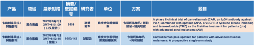 在黑色素瘤領域,恒瑞醫藥的卡瑞利珠單抗聯合阿帕替尼(“雙艾(ai)”組合)在2022 ASCO共(gong)入選1項口頭報(bao)(bao)告和1項壁報(bao)(bao)展示。