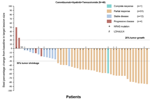 卡瑞利珠單抗聯合阿帕替尼和注射用替莫唑胺的三藥聯合方案在全球屬于首創,其在一線治療晚期肢端黑色素瘤的研究取得了令人振奮的結果。66.7%的客觀緩解率超過了既往文獻報道中其他任何肢端黑色素瘤中探索的藥物組合[4],患(huan)者的無進展生存(cun)期顯(xian)著提升,安全(quan)性可控。本研究(jiu)的出色(se)數據為肢端(duan)黑色(se)素瘤一(yi)線治(zhi)療探索了新的可能,有(you)望滿足國際社會(hui)對于肢端(duan)黑色(se)素瘤治(zhi)療方(fang)案的迫切需求。