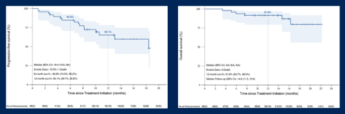 本研究中位隨訪時間為14個月,6個月PFS率為84.8%,12個月PFS率為65.1%,中位PFS為18.4個月。12個月OS率91.6%,中位OS未達到(圖5)[1]。