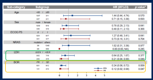 亞組分(fen)析發(fa)現,相較于基線時乳酸脫氫(qing)酶(mei)(LDH)升高(gao)的患者(zhe),基線時LDH正常的患者(zhe)的OS有獲益趨勢(shi);達到PR的患者(zhe)有較好的PFS和OS(圖(tu)6)。