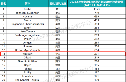 專利是(shi)藥(yao)(yao)企(qi)最(zui)有價值的(de)資產(chan)之一,是(shi)企(qi)業(ye)發(fa)展的(de)基(ji)石,對(dui)做原創創新的(de)企(qi)業(ye)尤為重要。全球專利數(shu)據庫(ku)incoPat創新指數(shu)研究中(zhong)心對(dui)2022年(nian)(nian)1月1日至2022年(nian)(nian)6月15日公(gong)開的(de)全球生(sheng)物(wu)醫(yi)藥(yao)(yao)產(chan)業(ye)發(fa)明專利申請數(shu)量進行統計排(pai)名,生(sheng)物(wu)醫(yi)藥(yao)(yao)產(chan)業(ye)專利涉及生(sheng)物(wu)技(ji)術藥(yao)(yao)、基(ji)因(yin)工(gong)程(cheng)藥(yao)(yao)物(wu)、疫苗、診斷試劑、微生(sheng)態(tai)制(zhi)(zhi)劑、血液制(zhi)(zhi)品等(deng)技(ji)術領域。入榜企(qi)業(ye)/醫(yi)院主(zhu)要來自(zi)13個國家、組織或地(di)區,羅氏(shi)、強生(sheng)、諾華分別位(wei)(wei)列前(qian)三(san),恒瑞醫(yi)藥(yao)(yao)(231件)排(pai)名第13位(wei)(wei),領跑中(zhong)國藥(yao)(yao)企(qi)。
