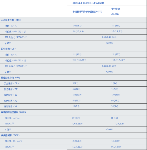 研究主要終點為總生存期(OS)和(he)由盲(mang)態(tai)獨立(li)影像評(ping)(ping)審委員會(BIRC)基于RECIST v1.1標準評(ping)(ping)估的(de)無(wu)進展(zhan)生存期(PFS);次要終點包(bao)括疾病進展(zhan)時(shi)間(TTP)、客觀緩(huan)解(jie)率(ORR)、疾病控制(zhi)率(DCR)和(he)緩(huan)解(jie)持(chi)續時(shi)間(DoR);安全(quan)性;藥代動力學和(he)免疫(yi)原(yuan)性分析(xi)。