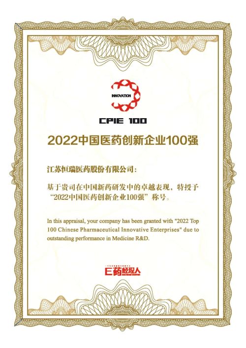 恒瑞醫藥獲評“中國醫藥創新企業100強”及“中國醫藥創新升級榜樣”TOP2