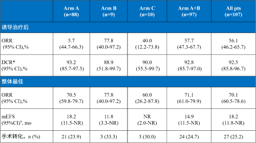 招募107例(li)(li)患(huan)者(A/B/C組:n=88/9/10;中位年齡59歲; 鱗狀(zhuang)NSCLC占比(bi)76.6%;IIIA/B/C期(qi):25.2%/43.9%/29.9%)。在所(suo)有的(de)患(huan)者中,誘導(dao)后ORR和最(zui)佳整體(ti)ORR分別(bie)是56.1% (95% CI 46.2-65.7) 和 70.1% (60.5-78.6)。中位無事件(jian)生存(cun)期(qi)(mEFS)為18.2 個(ge)月 (95% CI 11.8-未(wei)達(da)(da)(da)到(dao) [NR])。每個(ge)研究組的(de)有效性如表(biao)所(suo)示(shi)。27例(li)(li)患(huan)者(25.2%;基線分期(qi) IIIA/B/C:37.0%/44.4%/18.5%)接受手術(葉切(qie)除(chu)術/雙肺(fei)葉切(qie)除(chu)術/肺(fei)切(qie)除(chu)術:88.9%/7.4%/3.7%);均達(da)(da)(da)到(dao)R0切(qie)除(chu)。在這些患(huan)者,12例(li)(li)(44.4%)達(da)(da)(da)到(dao)MPR和7例(li)(li)(25.9%)達(da)(da)(da)到(dao)完全(quan)病(bing)理緩解(jie)(pCR)。在14例(li)(li)患(huan)者中觀察到(dao)淋巴結降期(qi)(51.9%;pN2到(dao)pN0/1, 8/14 [57.1%];pN3 到(dao) pN0-2, 6/9 [66.7%]),在切(qie)除(chu)的(de)患(huan)者中mEFS未(wei)達(da)(da)(da)到(dao)(NR)。沒有新的(de)安全(quan)性信號(hao)發生。