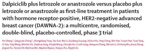 5月12日,達爾西利聯合來曲唑或阿那曲唑一線治療HR+/HER2-晚期乳腺癌的Ⅲ期DAWNA-2研究期中分析結果全文在線發表于國際腫瘤學領域頂級期刊《柳葉刀·腫瘤學》(The Lancet Oncology,影響因子:54.433)[1]。中國(guo)醫學科學院腫瘤(liu)醫院徐兵河(he)院士牽頭(tou)開展該研(yan)究。