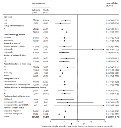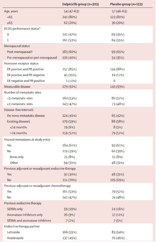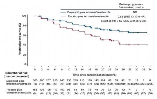 主(zhu)要研(yan)究終(zhong)(zhong)點是(shi)研(yan)究者(zhe)評估(gu)的PFS(預設單側P≤0.0076為優(you)效)。次(ci)要研(yan)究終(zhong)(zhong)點為盲法獨立審查委員會(BIRC)評估(gu)的PFS、總生存(OS)、客(ke)觀緩解(jie)率(ORR)、臨床獲益(yi)率(CBR)、緩解(jie)持續時間(DoR)和安全性。根據內臟轉移(是(shi)vs否)、既往(新)輔助(zhu)接受內分泌(mi)治療(是(shi)vs否)和試(shi)驗中聯用何(he)種非甾體類芳香化酶(mei)抑(yi)制(zhi)劑(來(lai)曲(qu)唑vs阿那曲(qu)唑)對患者(zhe)進行分層。