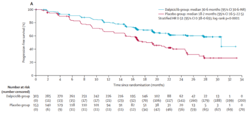 DAWNA-2研究在期中(zhong)分析(xi)時達到其主要終點(dian)。達爾(er)西利+來曲唑/阿那曲唑的(de)中(zhong)位(wei)PFS為30.6個(ge)(ge)月(yue)(yue)(95% CI: 30.6-未達到[NR]),安慰(wei)劑+來曲唑/阿那曲唑為18.2個(ge)(ge)月(yue)(yue)(95% CI: 16.5-22.5),聯合達爾(er)西利治療延(yan)長了12.4個(ge)(ge)月(yue)(yue)的(de)PFS,降低疾病進(jin)展或(huo)死亡(wang)風險49%(HR=0.51;95% CI: 0.38-0.69,P<0.0001)。研究者評估的(de)PFS與BIRC評估的(de)PFS相似(si)(NR vs 22.5個(ge)(ge)月(yue)(yue),HR=0.50)。
