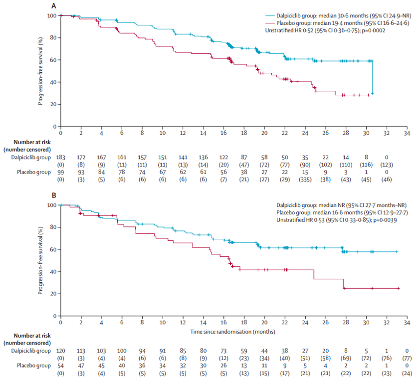 研究者評估的絕經后(A)和絕經前/圍絕經期(B)患者的PFS