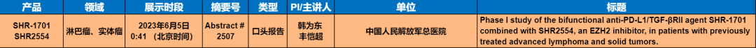 由中國人(ren)民解放軍總醫院韓為東教授、豐愷(kai)超(chao)教授團隊開(kai)展的(de)“雙功能抗PD-L1/TGF-βRII藥物SHR-1701聯(lian)合(he)EZH2抑制劑(ji)SHR2554治療(liao)經治的(de)晚期(qi)淋巴(ba)瘤和(he)實體瘤患者(zhe)I期(qi)研究”成功入選口頭報告。