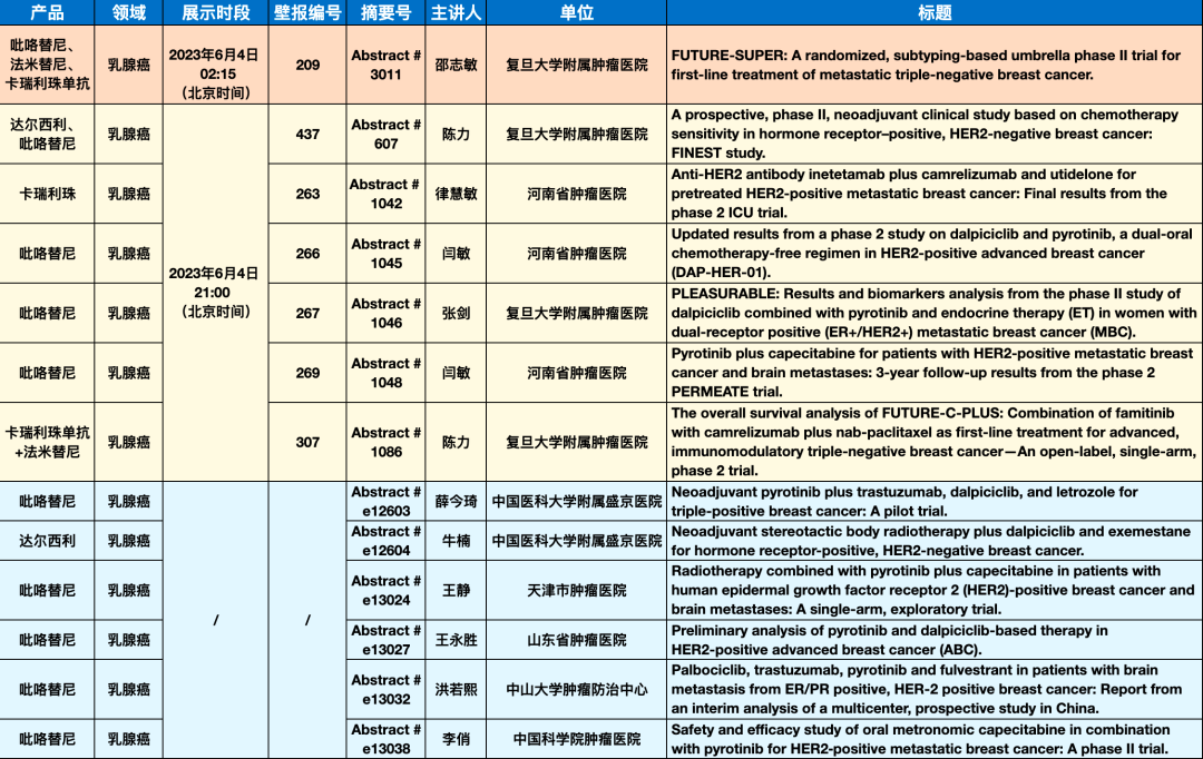 在乳腺癌(ai)領(ling)域(yu),吡咯(ge)替(ti)尼(ni)、達(da)爾(er)西(xi)利(li)、卡瑞利(li)珠單(dan)抗、法米(mi)替(ti)尼(ni),或(huo)(huo)產品間聯合(he)或(huo)(huo)聯合(he)化療,共有13項(xiang)研究入(ru)選(包括1項(xiang)壁報討論、6項(xiang)壁報展示和6項(xiang)線上發表)。