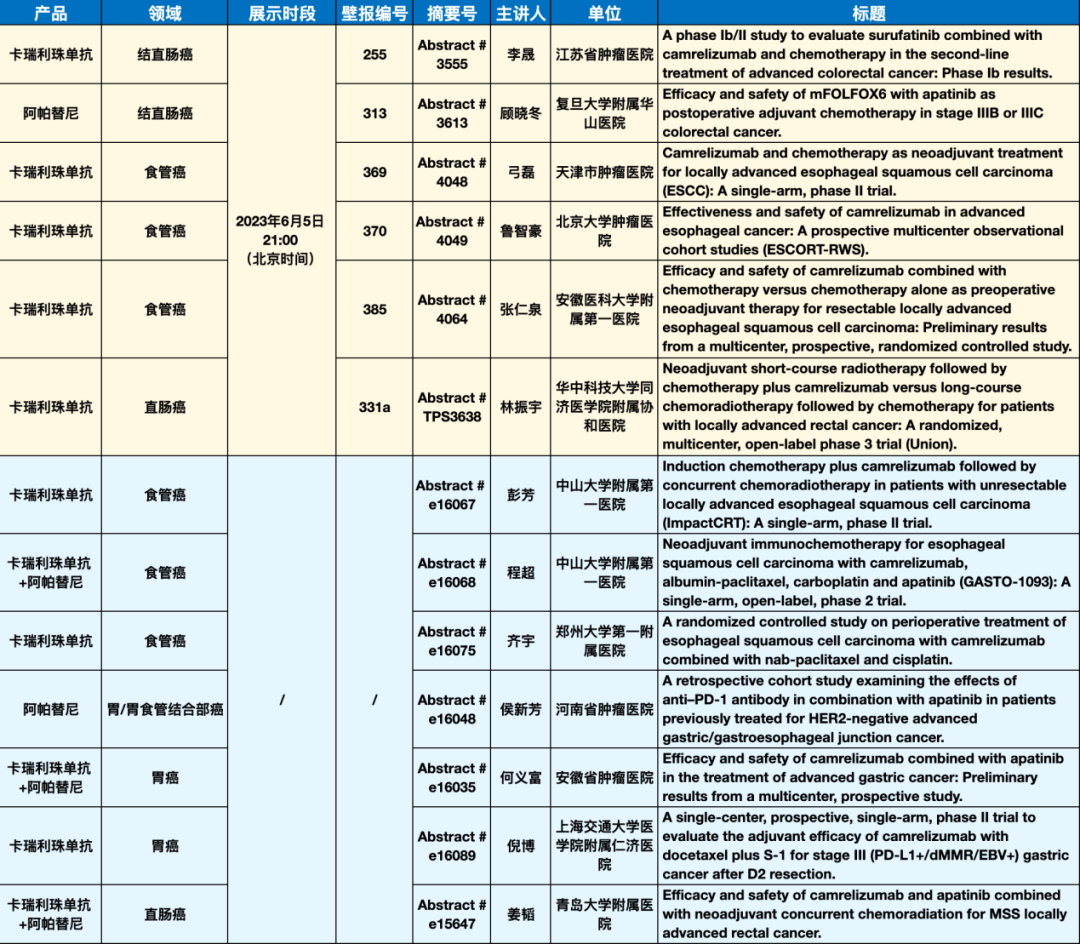 在消化道腫瘤(liu)領域,卡(ka)瑞利珠單抗和阿(a)帕替尼(ni)共(gong)有13項(xiang)(xiang)(xiang)研究(jiu)入選(包括6項(xiang)(xiang)(xiang)壁報(bao)展示和7項(xiang)(xiang)(xiang)線上發(fa)表)。