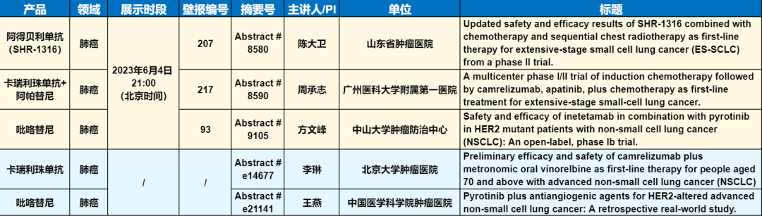 在肺癌領域,阿得貝(bei)利(li)單抗、卡瑞利(li)珠單抗、阿帕替尼(ni)、吡(bi)咯替尼(ni)等產(chan)品的單藥或(huo)聯合治療方(fang)案相關(guan)研(yan)究(jiu)共有5項研(yan)究(jiu)入(ru)選(xuan)(包括3項壁報(bao)展示和(he)2項線上發表)。