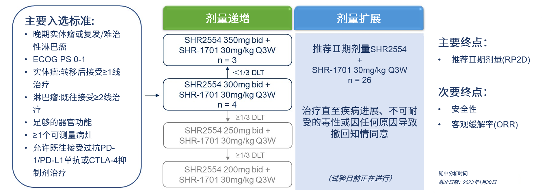 劑量(liang)擴展期(qi),給予SHR2554的(de)推薦Ⅱ期(qi)劑量(liang)(RP2D)加(jia)SHR-1701。主要研究終(zhong)點(dian)是RP2D,次(ci)要終(zhong)點(dian)是安(an)全性和客觀(guan)緩解率(lv)(ORR)。