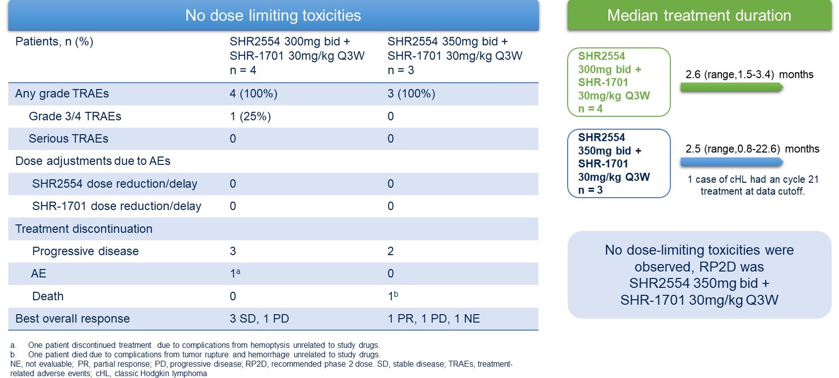 這(zhe)是第一項研究(jiu)抗PD-L1/TGF-βRII藥物聯合EZH2抑制劑對復(fu)發/難(nan)治(zhi)性(xing)淋巴瘤和(he)實體瘤患者的(de)(de)安(an)全性(xing)和(he)有(you)效(xiao)性(xing)的(de)(de)前(qian)瞻(zhan)性(xing)研究(jiu)。該研究(jiu)初(chu)步(bu)結果(guo)顯示(shi),SHR-1701聯合SHR2554在既往接受(shou)過(guo)免疫治(zhi)療的(de)(de)cHL患者中顯示(shi)出(chu)可接受(shou)的(de)(de)安(an)全性(xing)特征以及令人鼓舞的(de)(de)抗腫瘤活性(xing)。該結果(guo)為(wei)進一步(bu)的(de)(de)探索(suo)奠定了基礎。