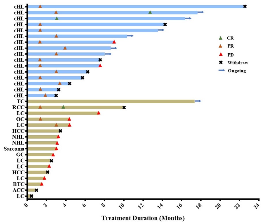 在26例可評(ping)估療效的人群中,客觀緩解(jie)率(ORR)為(wei)57.7%,其中2例完全緩解(jie)(CR),1例為(wei)轉(zhuan)移(yi)性腎細胞癌(ai)患者(zhe),另1例為(wei)cHL患者(zhe)。