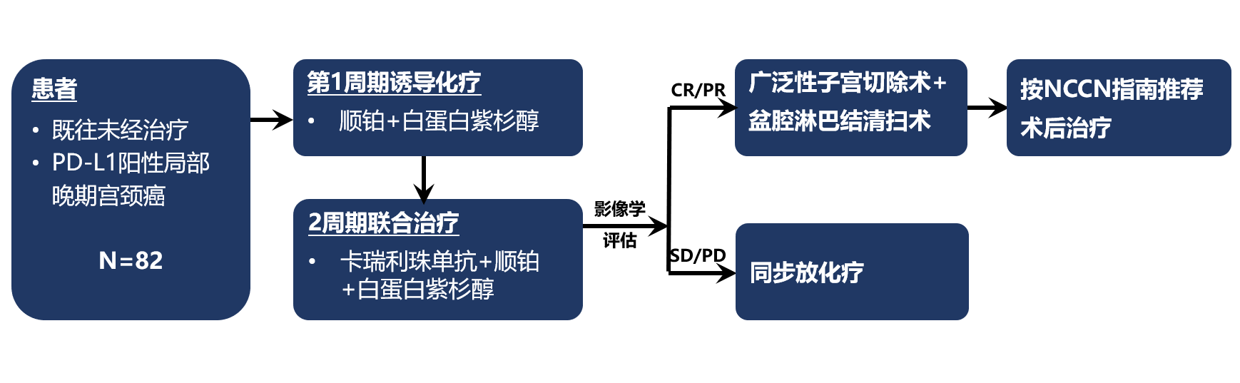 這是一項多中(zhong)心、單(dan)臂(bei)II期(qi)臨床研究,納入既往未(wei)經治(zhi)療(liao)(liao)(liao)、PD-L1表達陽性(CPS≥1)、局部晚期(qi)(FIGO IB3、IIA2和(he)≥4cm IIB/IIIC1r 期(qi))宮頸癌患(huan)(huan)(huan)者(zhe)(zhe)。患(huan)(huan)(huan)者(zhe)(zhe)先(xian)接受1個(ge)周期(qi)誘(you)導化(hua)療(liao)(liao)(liao),再接受2個(ge)周期(qi)化(hua)療(liao)(liao)(liao)聯(lian)合卡瑞利(li)珠單(dan)抗治(zhi)療(liao)(liao)(liao),療(liao)(liao)(liao)效(xiao)評估為CR/PR的患(huan)(huan)(huan)者(zhe)(zhe)接受手(shou)術(根據NCCN指南推薦(jian)術后輔(fu)助治(zhi)療(liao)(liao)(liao)),SD/PD患(huan)(huan)(huan)者(zhe)(zhe)則接受同步放(fang)化(hua)療(liao)(liao)(liao)。