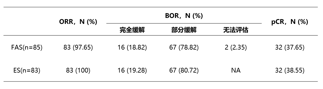 全分析集(FAS)85例(li)患者ORR為(wei)97.65%,其中,16例(li)為(wei)CR,pCR率(lv)為(wei)37.65%。2例(li)患者接受(shou)卡瑞利(li)珠單抗治(zhi)療后退出,未進(jin)行影像學評(ping)估。在療效可評(ping)估人(ren)群(ES)中,所有患者疾病均得到緩(huan)解,ORR為(wei)100%,pCR率(lv)為(wei)38.55%。