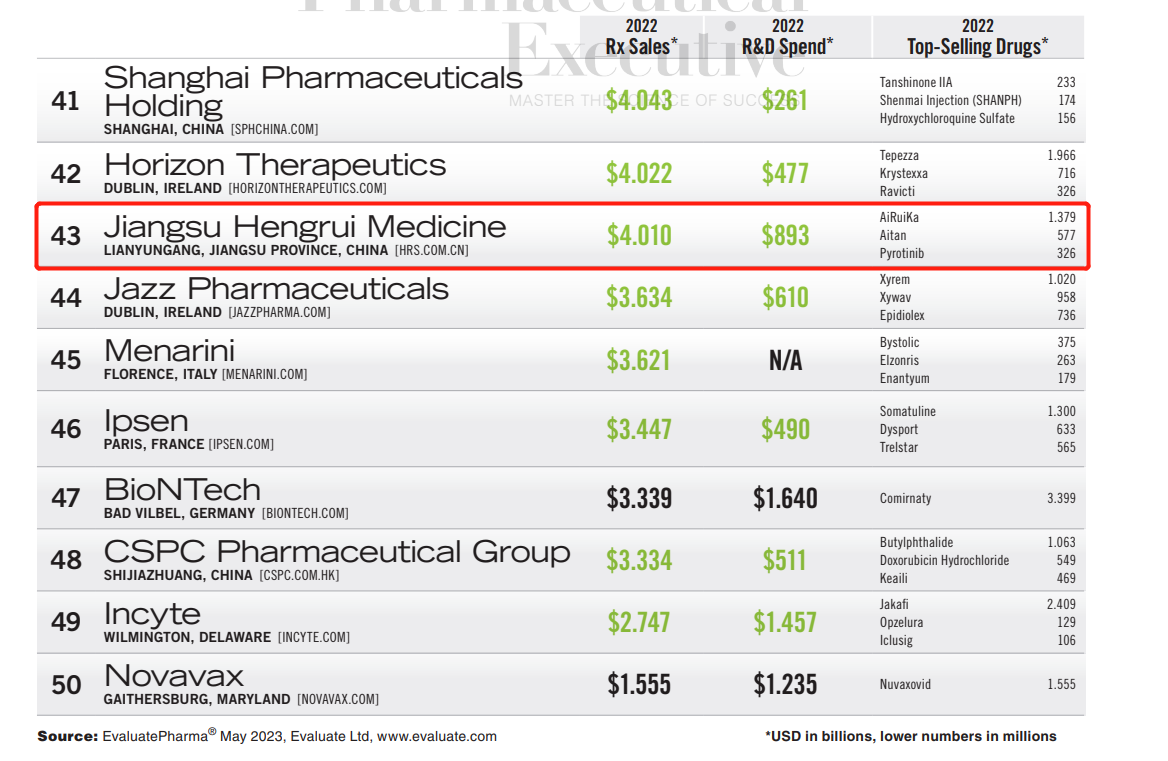 PharmExec是國際制藥(yao)(yao)界知名(ming)的醫藥(yao)(yao)專業雜志,今年(nian)(nian)是該雜志第23次推出全球制藥(yao)(yao)企(qi)業TOP50榜(bang)單,主(zhu)要依(yi)據各大(da)藥(yao)(yao)企(qi)2022財年(nian)(nian)處方(fang)藥(yao)(yao)銷售收入進行排名(ming),共(gong)有4家中國藥(yao)(yao)企(qi)入選(xuan)。