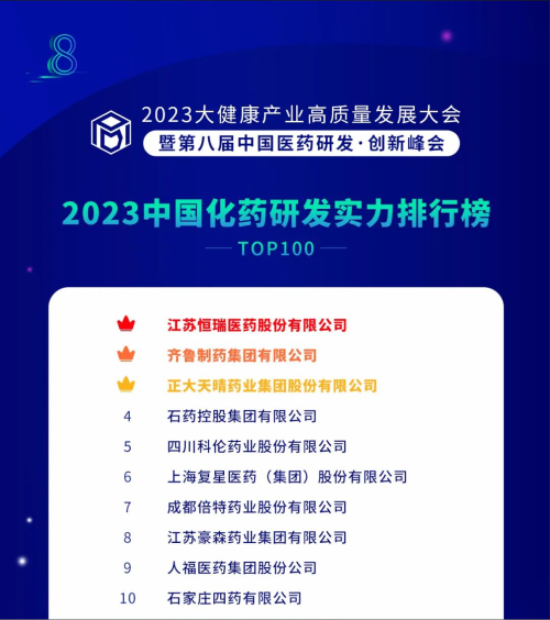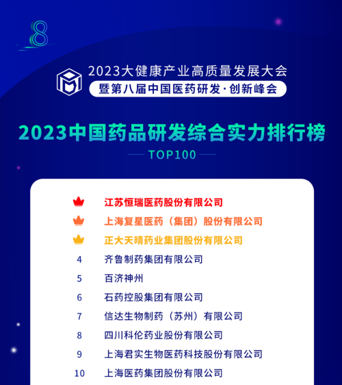 由(you)藥(yao)(yao)(yao)智(zhi)網、中(zhong)(zhong)國(guo)(guo)(guo)(guo)藥(yao)(yao)(yao)業(ye)雜志社主辦的2023大健康(kang)產(chan)業(ye)高(gao)質量發(fa)展大會暨第八屆中(zhong)(zhong)國(guo)(guo)(guo)(guo)醫藥(yao)(yao)(yao)研(yan)發(fa)?創(chuang)新峰會于(yu)6月(yue)16日開幕,會上發(fa)布了(le)《2023中(zhong)(zhong)國(guo)(guo)(guo)(guo)藥(yao)(yao)(yao)品研(yan)發(fa)實(shi)(shi)力排(pai)行榜(bang)(bang)》系列榜(bang)(bang)單,恒瑞醫藥(yao)(yao)(yao)憑借深厚的創(chuang)新研(yan)發(fa)實(shi)(shi)力再創(chuang)輝煌:榮(rong)登(deng)《2023中(zhong)(zhong)國(guo)(guo)(guo)(guo)藥(yao)(yao)(yao)品研(yan)發(fa)綜(zong)(zong)合實(shi)(shi)力排(pai)行榜(bang)(bang)TOP100》榜(bang)(bang)首(shou)、《2023中(zhong)(zhong)國(guo)(guo)(guo)(guo)化藥(yao)(yao)(yao)研(yan)發(fa)實(shi)(shi)力排(pai)行榜(bang)(bang)TOP100》榜(bang)(bang)首(shou)。值得一提的是,今年(nian)是恒瑞醫藥(yao)(yao)(yao)連續(xu)第6年(nian)入選《中(zhong)(zhong)國(guo)(guo)(guo)(guo)藥(yao)(yao)(yao)品研(yan)發(fa)綜(zong)(zong)合實(shi)(shi)力排(pai)行榜(bang)(bang)》榜(bang)(bang)首(shou)。