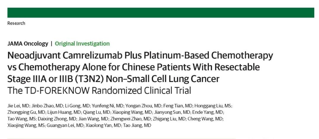[1] Lei J, Zhao JB, Gong L, et al. Neoadjuvant Camrelizumab Plus Platinum-Based Chemotherapy vs Chemotherapy Alone for Chinese Patients with Resectable Stage IIIA/IIIB (T3N2) Non-Small-Cell Lung Cancer: The TD-FOREKNOW Randomized Clinical Trial. JAMA ONCOL. 2023 Aug 3. doi: 10. 1001/jamaoncol.2023.2751.