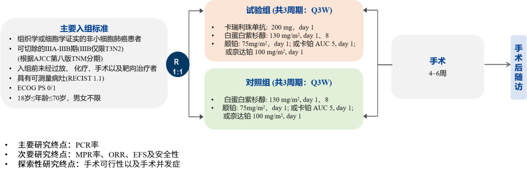 TD-FOREKNOW是一項(xiang)隨機對照、開放標簽(qian)、Ⅱ期(qi)(qi)臨床研究(jiu)(jiu)(NCT04338620), 納入新診斷(duan)的、經病理(li)確(que)診的ⅢA/ⅢB(T3N2)期(qi)(qi)NSCLC患者,按(an)照1:1隨機接受卡瑞(rui)利(li)珠(zhu)單(dan)抗聯合白(bai)蛋白(bai)紫杉醇和鉑類、或(huo)白(bai)蛋白(bai)紫杉醇和鉑類治療, 每三周(zhou)為一個周(zhou)期(qi)(qi), 共3周(zhou)期(qi)(qi),在末次治療4~6周(zhou)后(hou)進(jin)行手(shou)(shou)術。主(zhu)要研究(jiu)(jiu)終點(dian)(dian)為pCR率(lv),次要研究(jiu)(jiu)終點(dian)(dian)為主(zhu)要病理(li)緩(huan)解(jie)(MPR)率(lv)、客(ke)觀緩(huan)解(jie)率(lv)(ORR)、無事件生存期(qi)(qi)(EFS) 以及(ji)安全性(xing)。探索性(xing)研究(jiu)(jiu)終點(dian)(dian)為手(shou)(shou)術可行性(xing)以及(ji)并(bing)發癥。