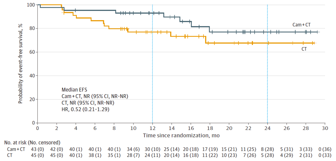 Cam+CT組(zu)(zu)(zu)和(he)(he)CT組(zu)(zu)(zu)末次新(xin)輔助治(zhi)療與手(shou)術(shu)的(de)(de)(de)中位間(jian)(jian)隔(ge)時(shi)間(jian)(jian)分別為(wei)4.7周(IQR 4.0-5.6)和(he)(he)4.6周(IQR 4.0-4.9)。Cam+CT組(zu)(zu)(zu)的(de)(de)(de)全肺(fei)切除(chu)術(shu)比率(lv)為(wei)10.0%,低于CT組(zu)(zu)(zu)的(de)(de)(de)19.0%。Cam+CT組(zu)(zu)(zu)和(he)(he)CT組(zu)(zu)(zu)分別有92.5%、 85.7%的(de)(de)(de)患者(zhe)達(da)到R0切除(chu),未影響手(shou)術(shu)可(ke)行性。在Modified ITT分析集中,與化療相比,卡瑞利珠單抗聯合化療顯著提高了患者(zhe)的(de)(de)(de)pCR率(lv)(32.6% vs. 8.9%,OR=4.95,95% CI:1.35-22.37,P=0.008);同時(shi)也改善了患者(zhe)的(de)(de)(de)MPR率(lv)(65.1% vs. 15.6%,OR=10.13,95% CI:3.32-32.76,P<0.001)和(he)(he)ORR(72.1% vs. 53.3%,OR=2.26,95% CI:0.85-6.08)。截至(zhi)2022年(nian)(nian)8月(yue)31日,EFS暫未成熟,Cam+CT組(zu)(zu)(zu)1年(nian)(nian)和(he)(he)2年(nian)(nian)的(de)(de)(de)EFS率(lv)分別達(da)到93.0%和(he)(he)76.9%,CT組(zu)(zu)(zu)則為(wei)76.9%和(he)(he)67.6%。