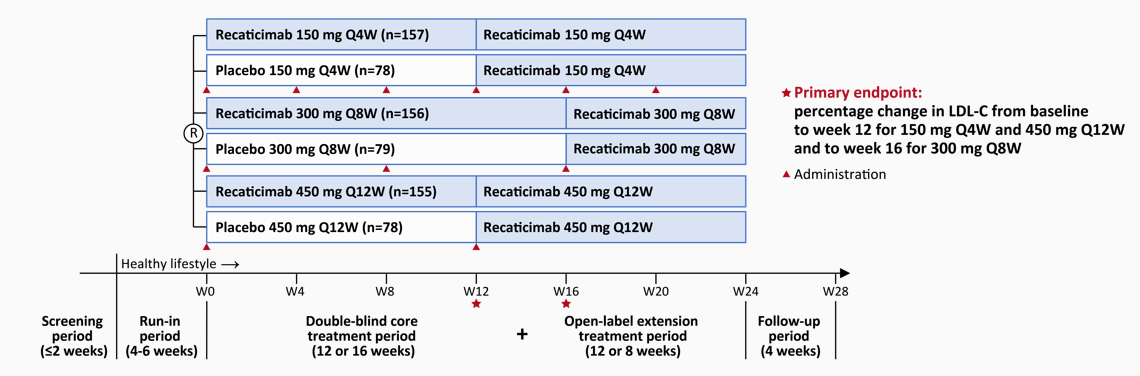 研究(jiu)主(zhu)要終點為(wei)與安慰劑相比(bi),瑞卡西單抗(kang)150mg Q4W和450mg Q12W治(zhi)療(liao)12周以及300mg Q8W治(zhi)療(liao)16周后,非家族(zu)性高(gao)膽固(gu)醇血癥和混合型(xing)高(gao)脂血癥患者LDL-C相對于基線(xian)變化的(de)百分比(bi)。