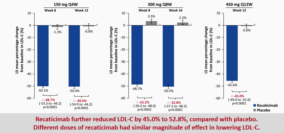 主(zhu)要終(zhong)點:與(yu)安慰劑相(xiang)比,瑞卡西單抗150mg Q4W治(zhi)療(liao)12周(zhou)后(hou)(hou)LDL-C相(xiang)對于(yu)基線(xian)降(jiang)低(di)49.6% (95% CI,44.2-54.9);300 mg Q8W治(zhi)療(liao)16周(zhou)后(hou)(hou)LDL-C相(xiang)對于(yu)基線(xian)降(jiang)低(di)52.8% (95% CI, 48.3-57.2);450 mg Q12W治(zhi)療(liao)12周(zhou)后(hou)(hou)LDL-C相(xiang)對于(yu)基線(xian)降(jiang)低(di)45.0% (95% CI, 41.0-49.0)(各組P<0.0001 vs. 安慰劑)。
