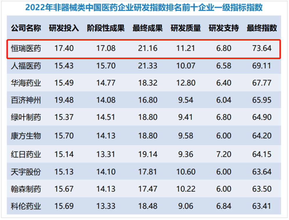 研發量質齊升,恒瑞醫藥蟬聯非器械類中國醫藥企業研發指數排名榜首