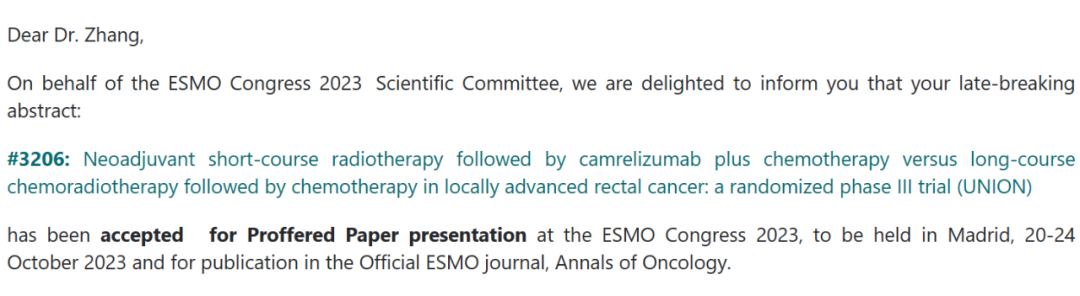 新輔助短程放療序貫卡瑞利珠單抗聯合化療對比長程放化療序貫化療治療局部晚期直腸癌的一項隨機對照Ⅲ期研究(UNION)入選2023 ESMO proffered paper presentation