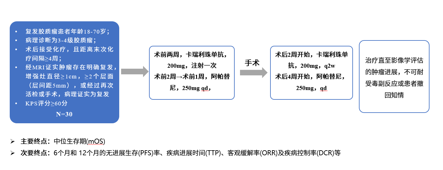 本研究(jiu)是一項(xiang)單(dan)(dan)(dan)中(zhong)心、單(dan)(dan)(dan)臂、前(qian)瞻性(xing)臨床研究(jiu)(NCT04588987)。主要入選標準(zhun)有(you):復發膠質(zhi)瘤患者(zhe)年(nian)齡18-70歲;病理診斷(duan)為3-4級膠質(zhi)瘤;KPS評分(fen)≥60分(fen)。排除標準(zhun)有(you):之前(qian)接受過免疫治(zhi)療及(ji)抗(kang)腫瘤血(xue)管生成藥(yao)物治(zhi)療。本研究(jiu)中(zhong),患者(zhe)接受卡(ka)瑞利珠(zhu)(zhu)單(dan)(dan)(dan)抗(kang),200mg/次,術前(qian)2周(zhou)注射一次,同(tong)時術前(qian)2周(zhou)開(kai)始(shi)口服阿帕替尼250mg/d,連續服用(yong)至術前(qian)7天停藥(yao)。術后2周(zhou)開(kai)始(shi)每2周(zhou)1次卡(ka)瑞利珠(zhu)(zhu)單(dan)(dan)(dan)抗(kang)劑量用(yong)法(fa)(fa)同(tong)上,術后4周(zhou)每日口服阿帕替尼劑量用(yong)法(fa)(fa)同(tong)上,直至影(ying)像(xiang)學發現(xian)腫瘤進展(zhan),或患者(zhe)不(bu)可耐(nai)受毒副反應。主要終點(dian)為中(zhong)位(wei)生存期(mOS)。關鍵次要終點(dian)包括6個月(yue)和 12個月(yue)的無(wu)進展(zhan)生存(PFS)率(lv)、疾(ji)病進展(zhan)時間(TTP)、客觀緩解(jie)率(lv)及(ji)疾(ji)病控制率(lv)等。