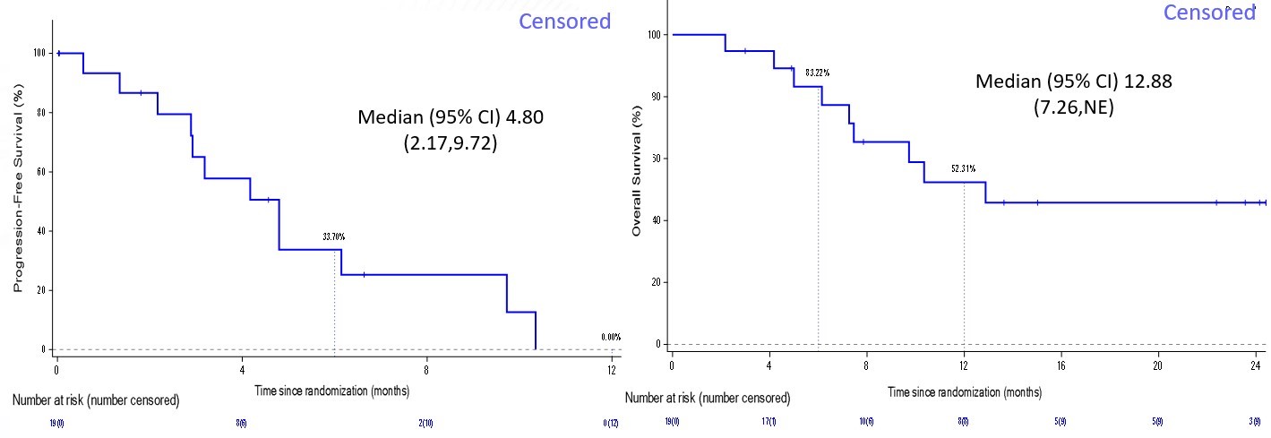 2020年10月(yue)(yue)至2023年8月(yue)(yue),共入(ru)組19例患者(zhe),其中15例為(wei)GBM。中位隨訪時間(jian)達(da)到22.37個(ge)月(yue)(yue)。中位PFS為(wei)4.80個(ge)月(yue)(yue)(95% CI:2.17–9.72),中位OS為(wei)12.88個(ge)月(yue)(yue)(95% CI :7.26–NE)。6個(ge)月(yue)(yue)PFS率為(wei)33.70%,6個(ge)月(yue)(yue)OS率為(wei)83.22%。12個(ge)月(yue)(yue)OS率為(wei)52.31%。
