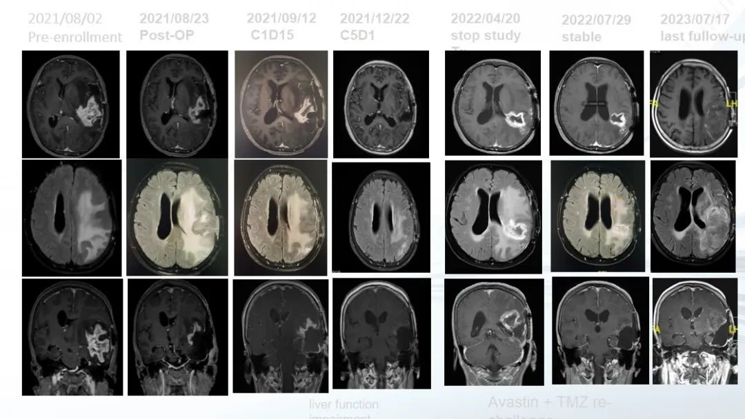 2022年改(gai)為貝伐珠單抗加(jia)TMZ小劑量方案。至2023年7月(yue)(末次隨訪)腫瘤(liu)穩(wen)定。患者自首次診斷生存(cun)(cun)已51個(ge)月(yue),入(ru)組本研究治療后生存(cun)(cun)已24個(ge)月(yue)。