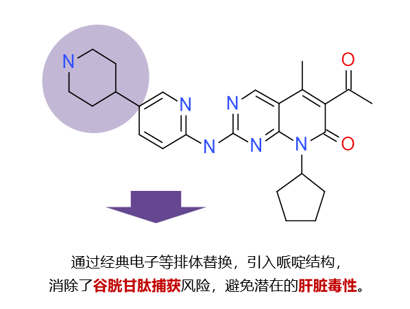 達爾西(xi)利在項目立項之初(chu),研(yan)發(fa)者就希望(wang)能夠降(jiang)低藥物(wu)的(de)肝毒性。在結構設(she)計中(zhong)(zhong),通過經典的(de)電子等排(pai)體替換引入哌啶基團,從而有效(xiao)地消除谷胱甘肽捕獲風(feng)險(圖1),這成為(wei)了達爾西(xi)利最大的(de)設(she)計亮點之一。臨(lin)床相(xiang)關(guan)研(yan)究中(zhong)(zhong),可以看到達爾西(xi)利相(xiang)關(guan)的(de)3~4級AST升高的(de)發(fa)生(sheng)率僅為(wei)0.4%,3~4級ALT升高的(de)發(fa)生(sheng)率甚(shen)至為(wei)0。