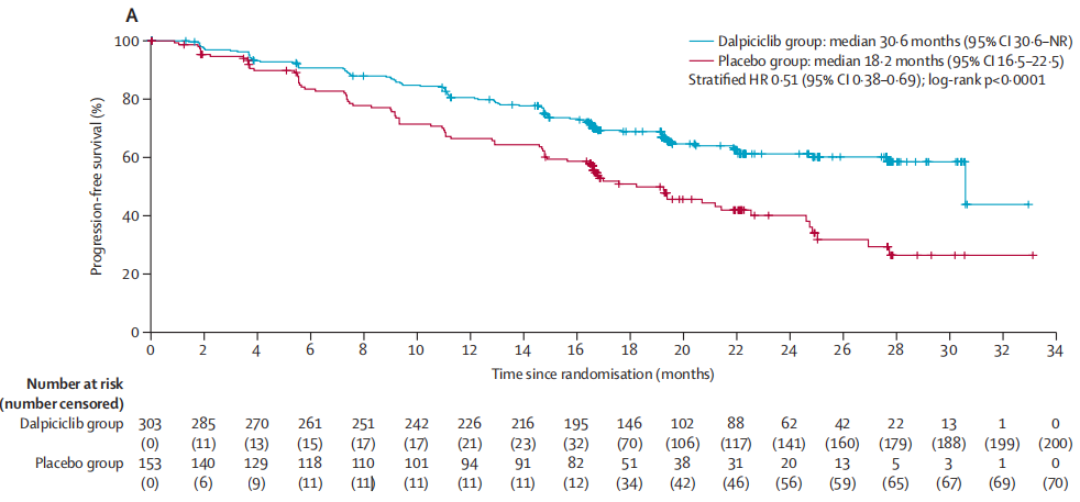 評(ping)估(gu)達爾西(xi)利聯(lian)合(he)來曲(qu)唑(zuo)/阿那曲(qu)唑(zuo)一線(xian)治療(liao)(liao)HR+/HER2-晚期乳(ru)腺癌的(de)療(liao)(liao)效與安全性的(de)DAWNA-2研究(jiu)也獲得(de)了令人鼓舞的(de)結果(guo)(guo),PFS延(yan)長了12.4個(ge)月(30.6 vs. 18.2個(ge)月),HR=0.51,降低了49%的(de)疾病進展風險(xian)(圖3),DAWNA-2研究(jiu)刷新了CDK4/6抑制劑(ji)聯(lian)合(he)非甾體類芳香化酶抑制劑(ji)一線(xian)治療(liao)(liao)HR+/HER2-晚期乳(ru)腺癌的(de)PFS和ORR記錄(lu),為藥物的(de)臨床應用提供了強(qiang)有力的(de)循(xun)證證據。該結果(guo)(guo)已經于2023年5月在線(xian)發表在《柳葉刀·腫(zhong)瘤(liu)學》(The Lancet Oncology,影響因子51.1)。