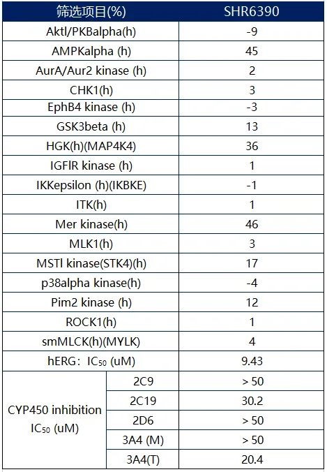 此外,達(da)爾(er)(er)西(xi)利具有良好(hao)的(de)(de)廣(guang)譜激酶選擇性。研(yan)究(jiu)結果顯(xian)示,達(da)爾(er)(er)西(xi)利的(de)(de)hERG抑制比(bi)較(jiao)弱(ruo)(表3)、心臟毒(du)性比(bi)較(jiao)小、QTC延(yan)長少見。此外,由于達(da)爾(er)(er)西(xi)利常(chang)和(he)其他藥物(wu)(wu)聯合使用(yong),研(yan)究(jiu)者密(mi)切關注(zhu)其藥物(wu)(wu)相互作(zuo)用(yong)(drug and drug interaction,DDI)風險(xian),發現達(da)爾(er)(er)西(xi)利對(dui)3A4M、3A4T底物(wu)(wu)抑制作(zuo)用(yong)比(bi)較(jiao)弱(ruo)(表3),意味著達(da)爾(er)(er)西(xi)利的(de)(de)DDI風險(xian)比(bi)較(jiao)低。
