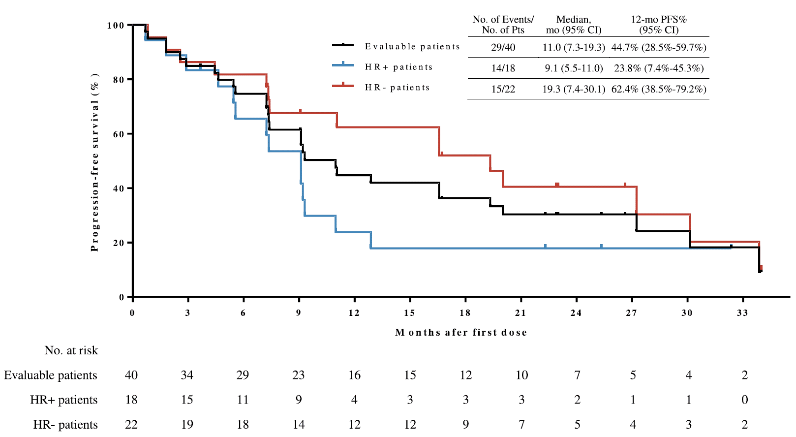 受試者的mPFS為11.0個(ge)月(yue),12個(ge)月(yue)PFS率為44.7%。OS數(shu)據尚未成熟,預估(gu)的12個(ge)月(yue)和18個(ge)月(yue)OS率分別為90.0%和82.5%。研究整體安全性可控,無新(xin)的安全性信號。