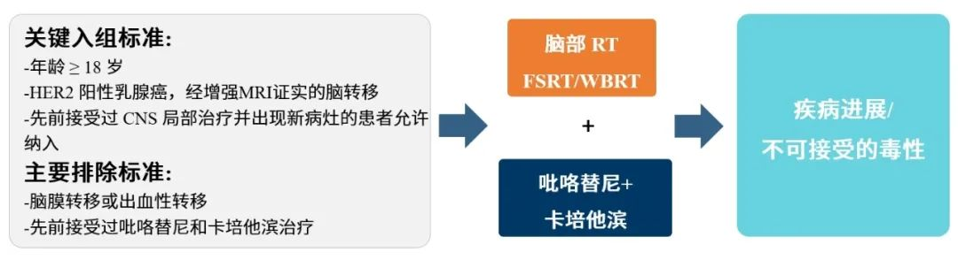 BROPTIMA研(yan)究(jiu)是(shi)一項單中心、單臂、Ⅱ期臨床研(yan)究(jiu)(NCT04582968)。入組HER2陽性經磁共振成(cheng)像(MRI)證實(shi)的(de)(de)(de)腦轉移(yi)患者。患者入組后(hou)根據(ju)方(fang)案(an)接受放療(liao)聯合吡咯(ge)替尼(ni)(400 mg,qd)和(he)卡(ka)培他濱(1000 mg/m2,bid,d1-14,q3w)治(zhi)療(liao)。其中放射治(zhi)療(liao)的(de)(de)(de)方(fang)案(an)由研(yan)究(jiu)者根據(ju)腦轉移(yi)灶的(de)(de)(de)大小、數量以及腦實(shi)質病變的(de)(de)(de)位(wei)置選擇全(quan)腦放療(liao)(WBRT 30 Gy/10fx)或分次(ci)(ci)立(li)體定向放療(liao)(FRST 8 Gy*3-5fx)。吡咯(ge)替尼(ni)和(he)卡(ka)培他濱在放療(liao)第一天至放射治(zhi)療(liao)療(liao)程結束后(hou)7天內(nei)開始都是(shi)被允許的(de)(de)(de)。研(yan)究(jiu)的(de)(de)(de)主(zhu)要(yao)終點是(shi)1年(nian)CNS-PFS率,顱內(nei)病灶采用RANO-BM評估標(biao)(biao)準(zhun),顱外病灶采用RECIST 1.1評估標(biao)(biao)準(zhun)。次(ci)(ci)要(yao)終點包括CNS-ORR、PFS、總生存期(OS)、安(an)全(quan)性和(he)認(ren)知功能評分。
